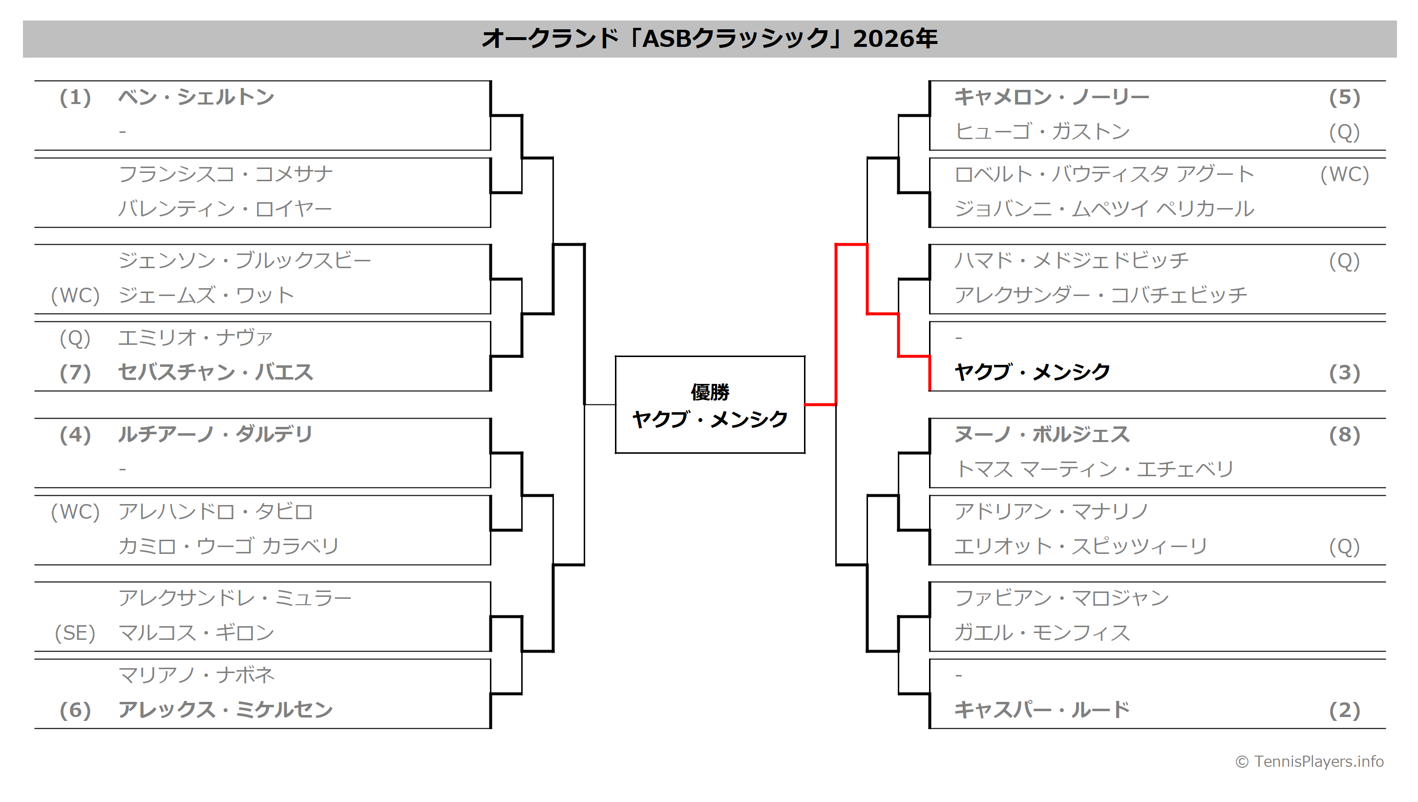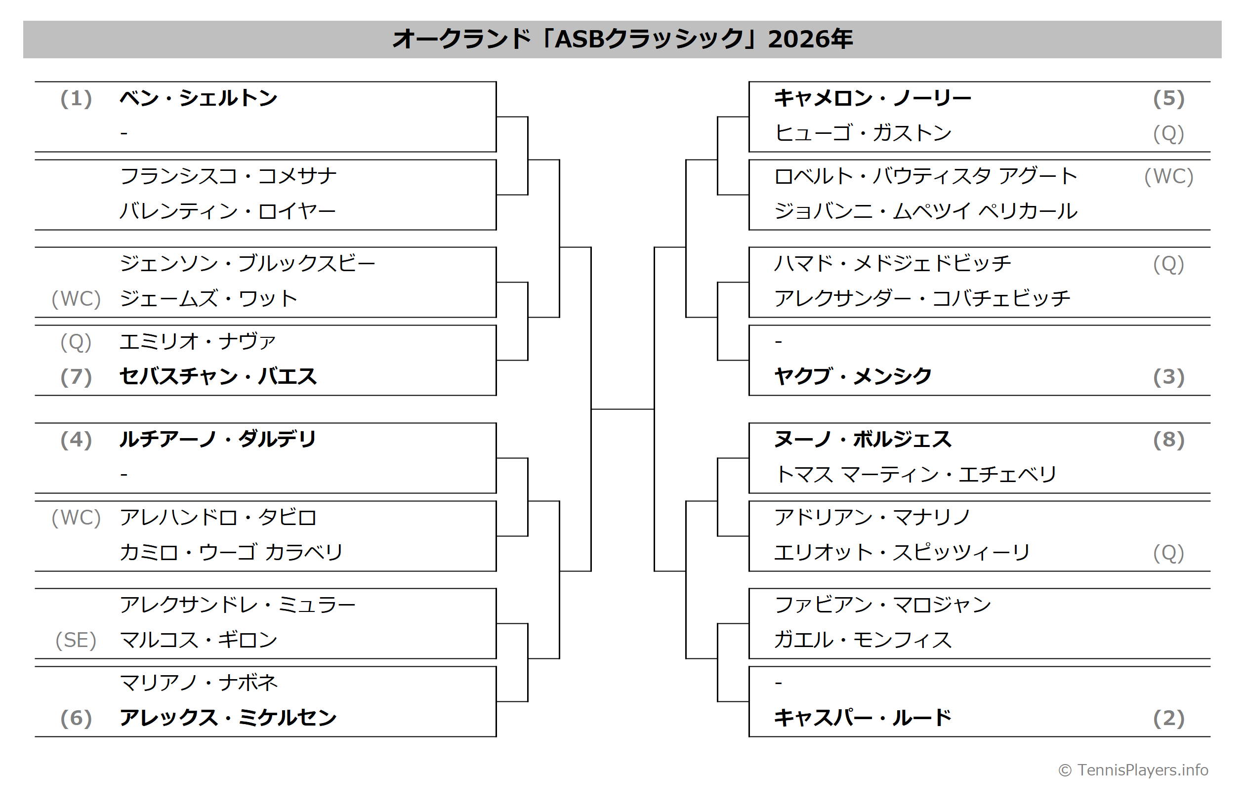 オークランド「ASBクラッシック」2025年トーナメント表(ドロー)結果あり・全出場選手:シェルトン・モンフィス他出場