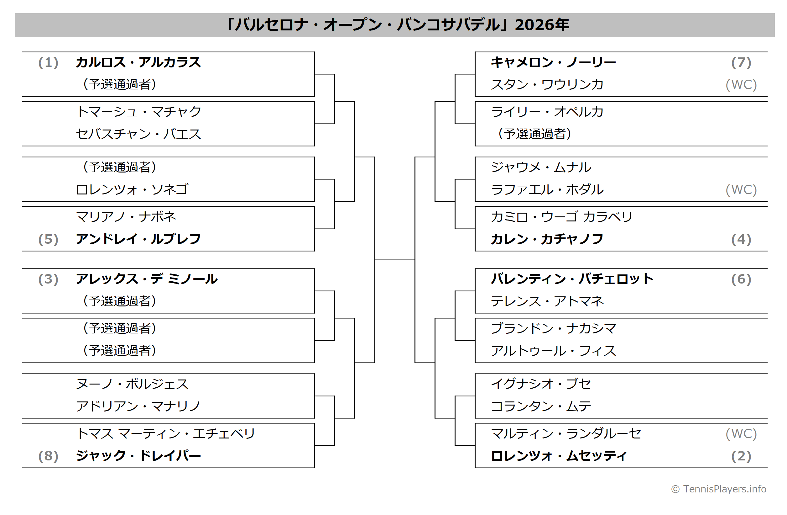 「バルセロナ・オープン・バンコサバデル」2026年トーナメント表(ドロー)結果あり