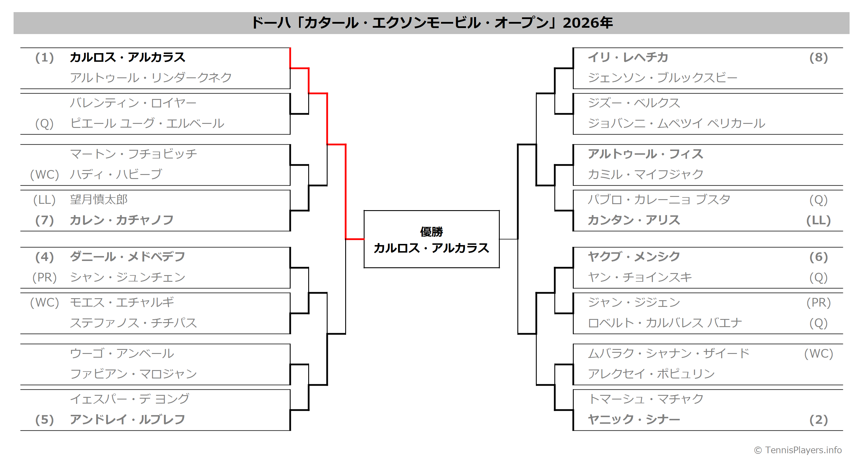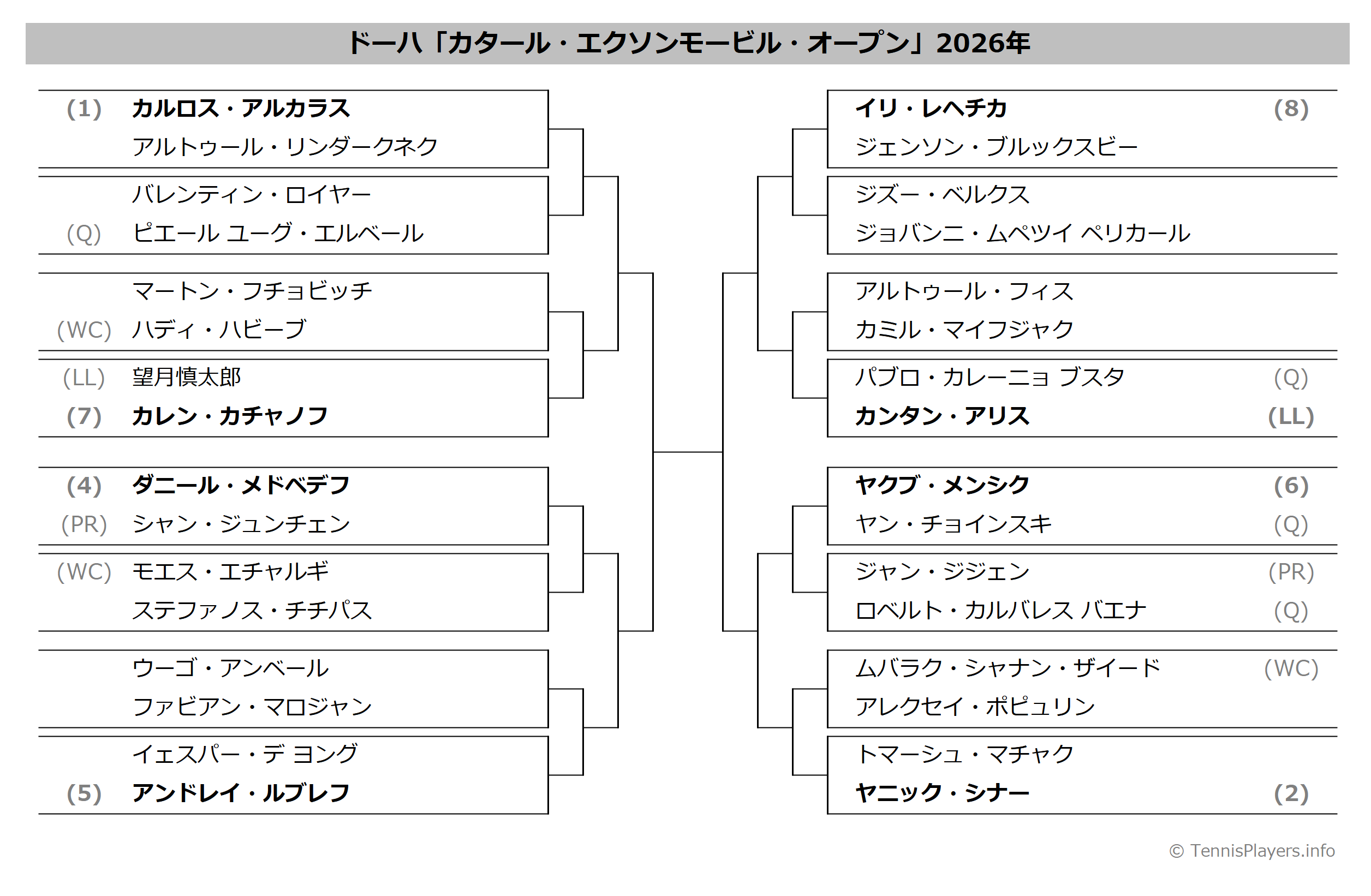 ドーハ「カタール・エクソンモービル・オープン」2026年トーナメント表(ドロー)結果あり