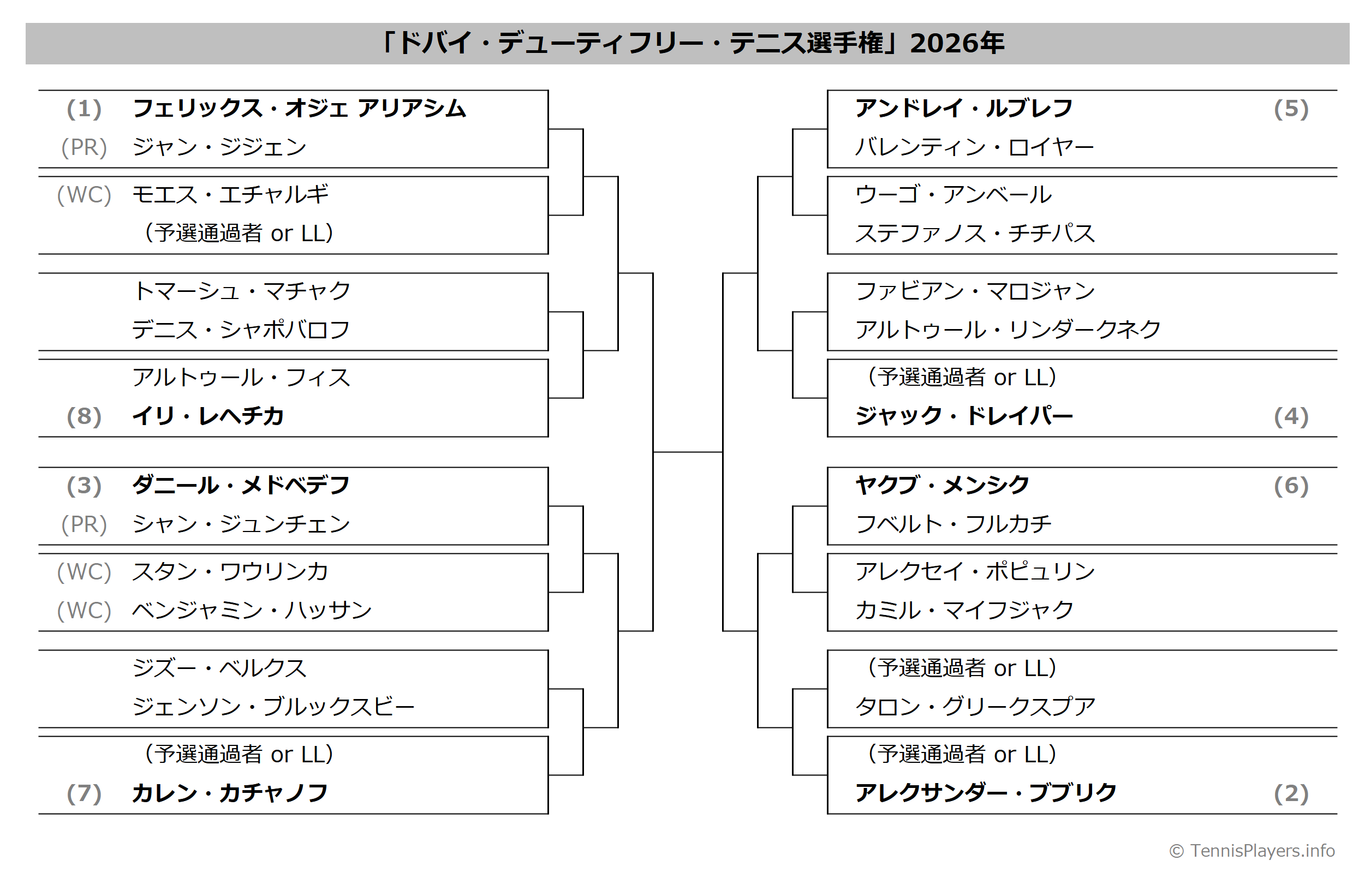 「ドバイ・デューティフリー・テニス選手権」2025年トーナメント表(ドロー)結果あり・全出場選手:メドベデフ・デミノール他出場