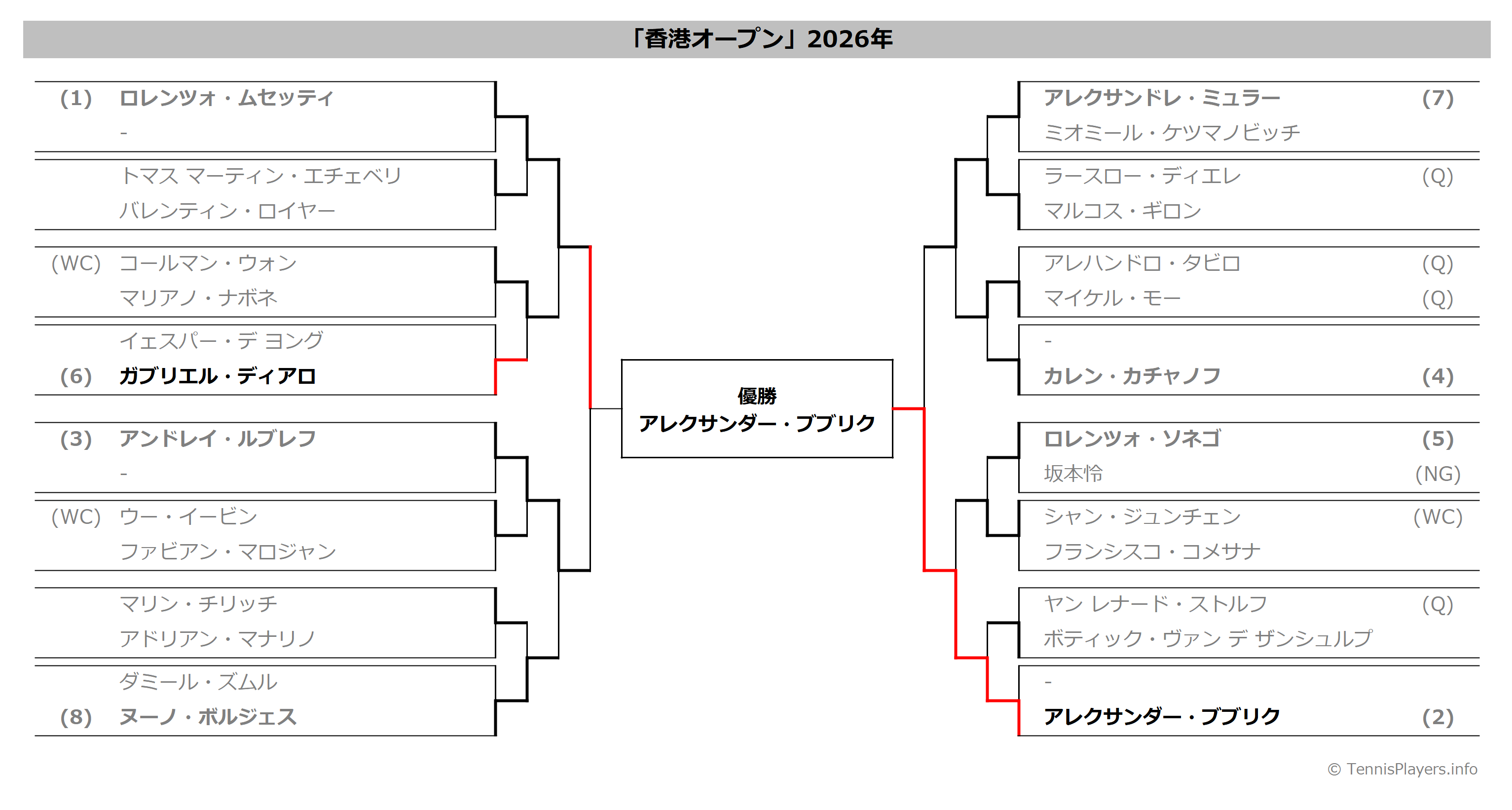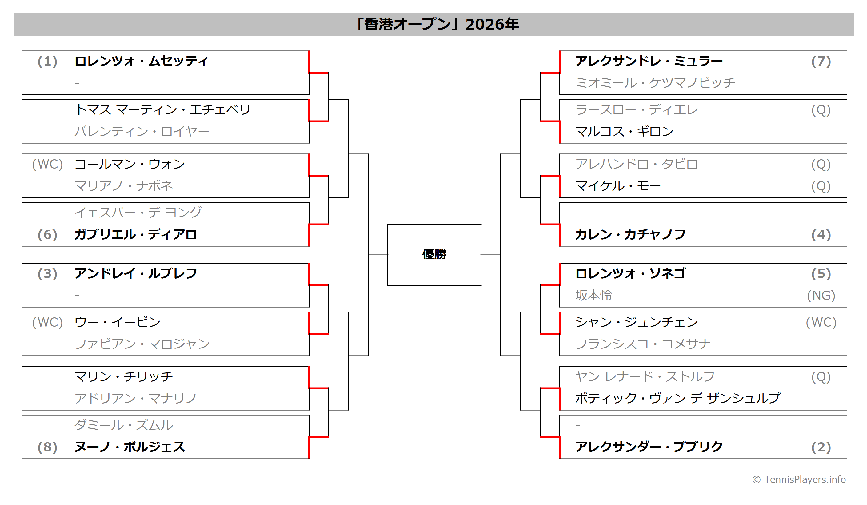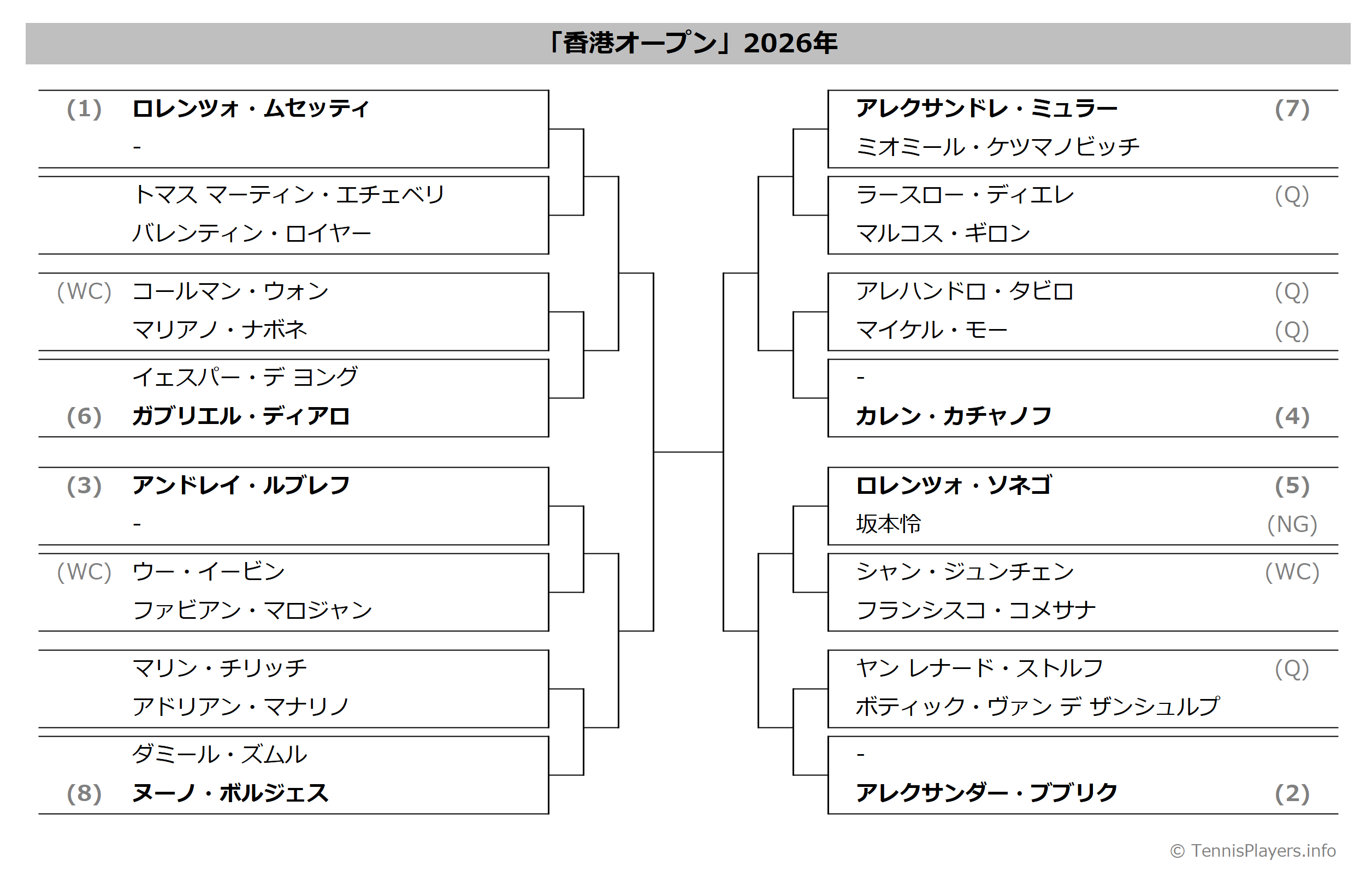 「香港オープン」2025年トーナメント表(ドロー)結果あり・全出場選手:錦織圭・ルブレフ・ムセッティ他出場