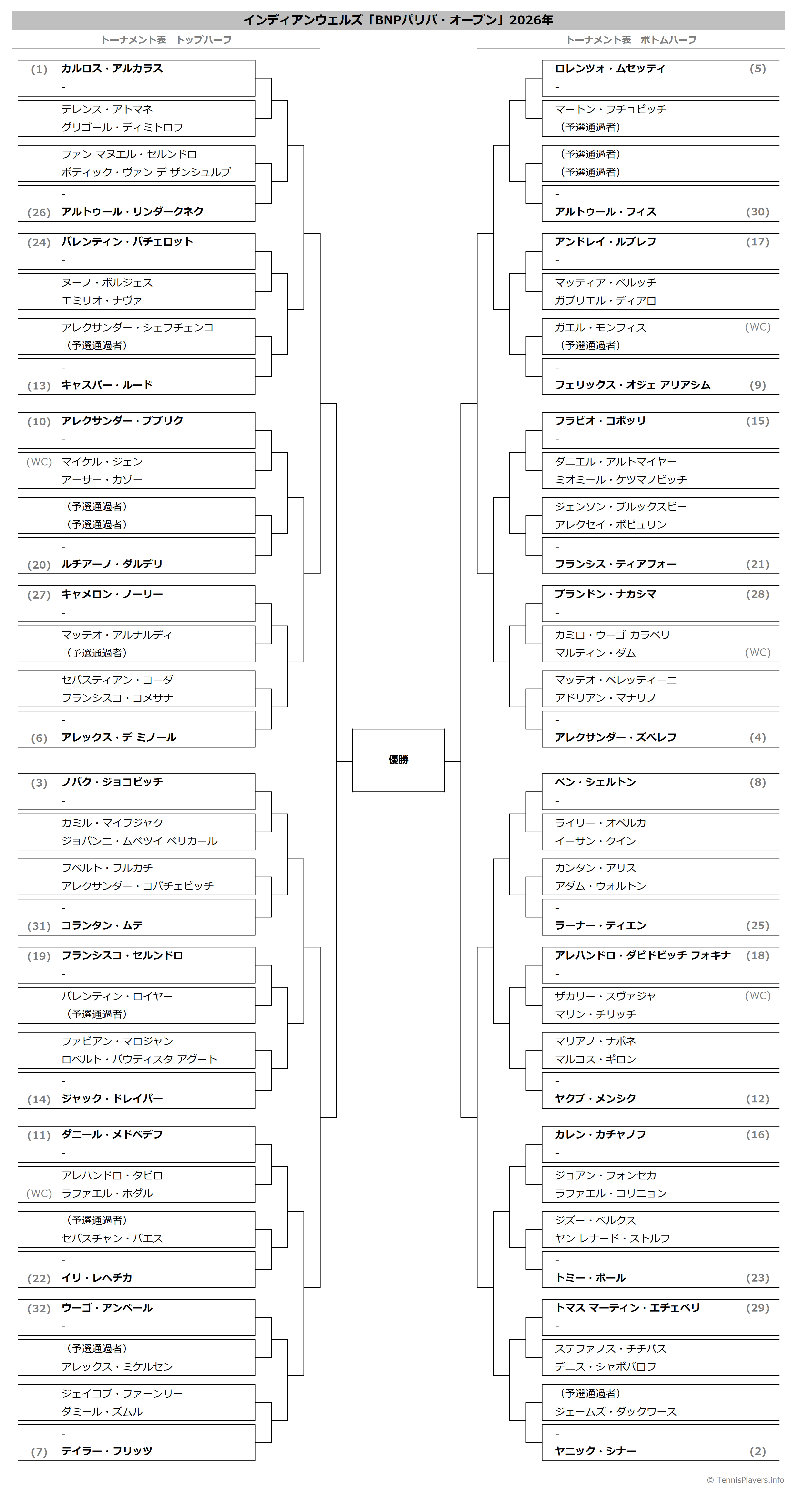 インディアンウェルズ「BNPパリバ・オープン」2026年トーナメント表(ドロー)結果あり