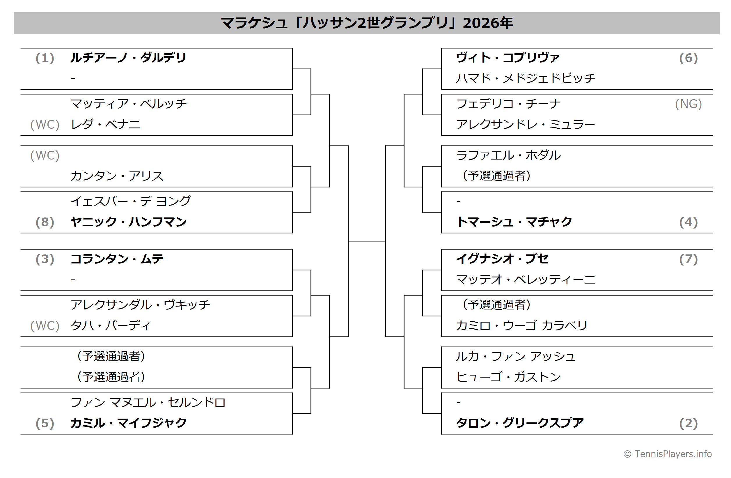 マラケシュ「ハッサン2世グランプリ」2026年トーナメント表(ドロー)結果あり