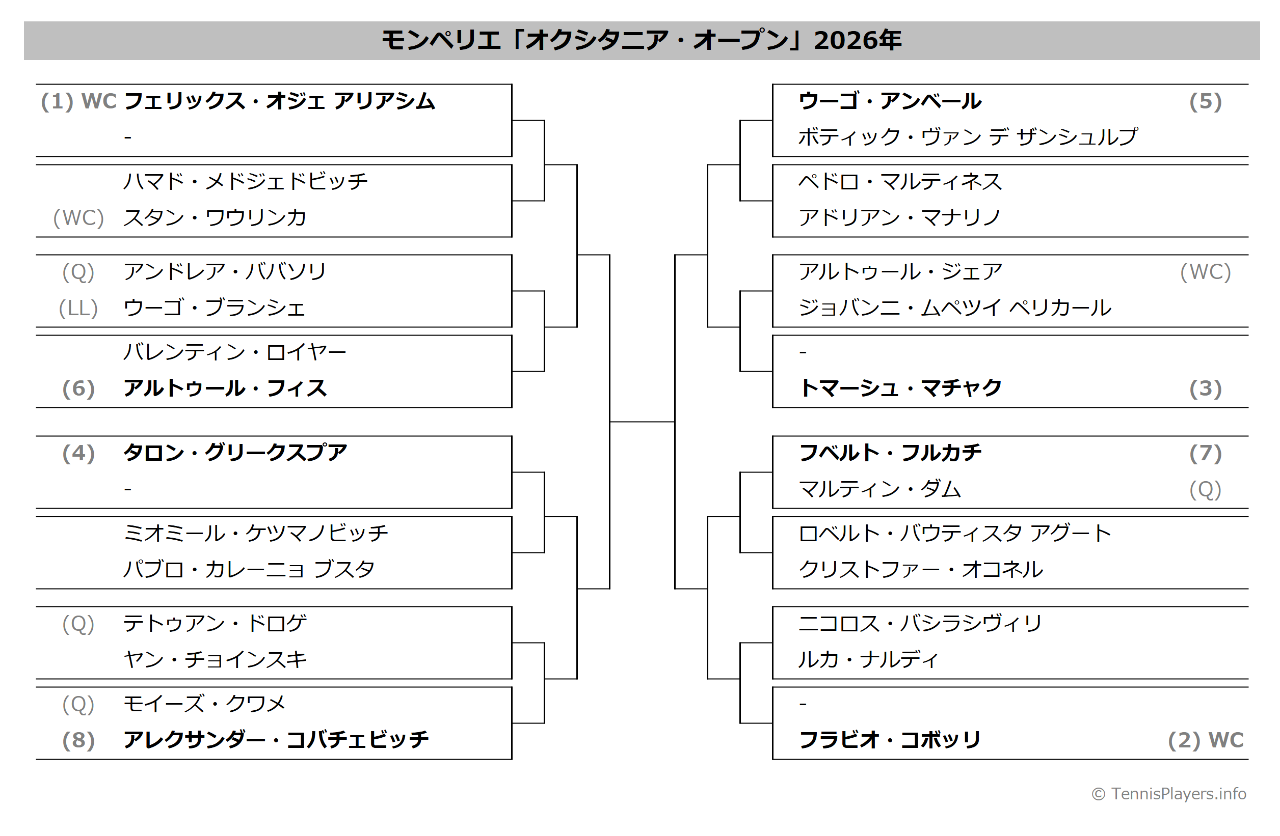 モンペリエ「オクシタニア・オープン」2025年トーナメント表(ドロー)結果あり・全出場選手:ルブレフ・Aアリアシム他出場