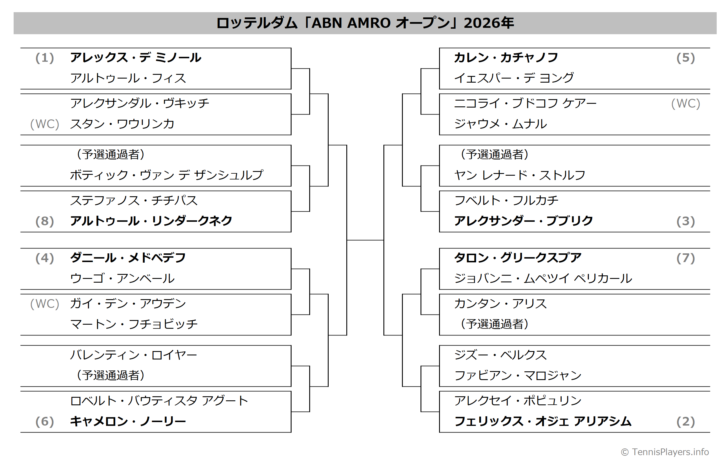 ロッテルダム「ABN AMRO オープン」2026年トーナメント表(ドロー)結果あり